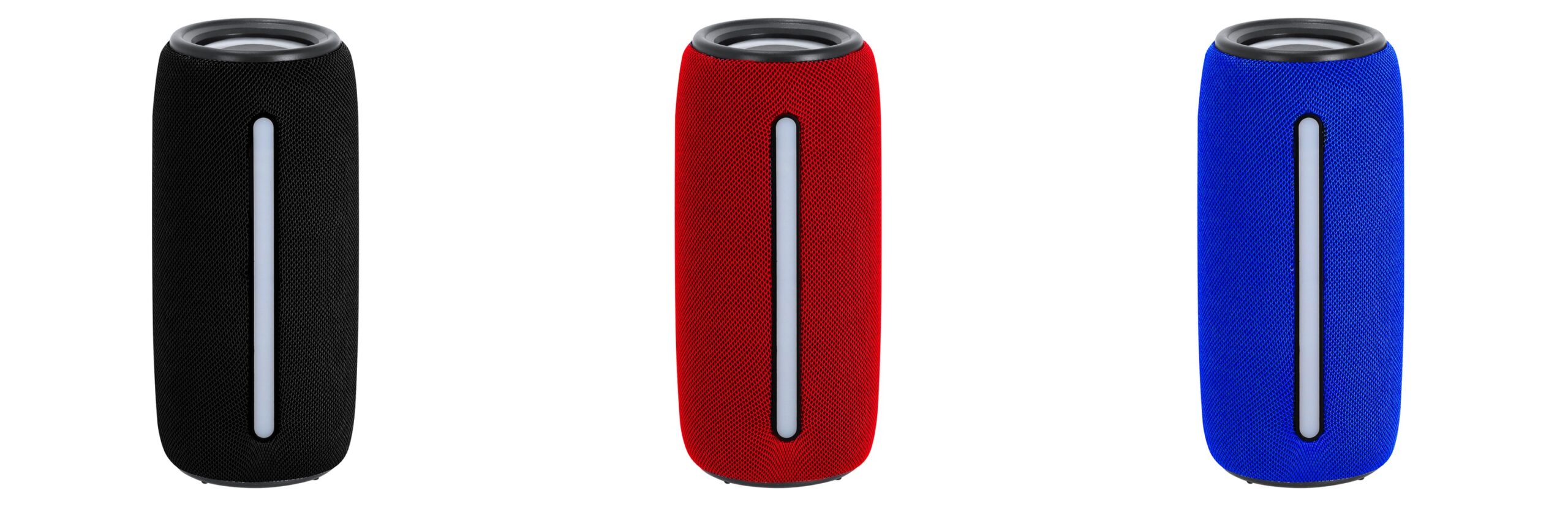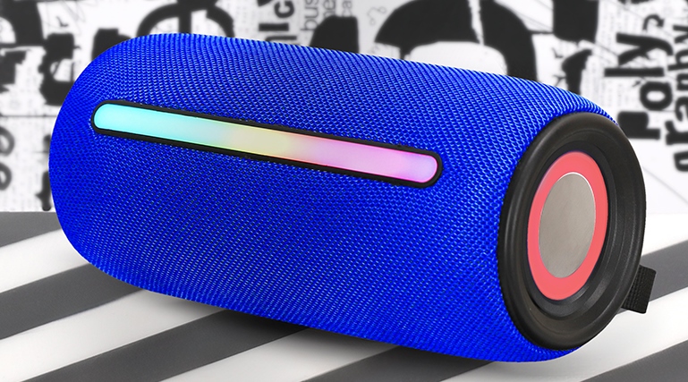 Bocina estéreo Bluetooth 2x5W con luz multicolor y función radio FM.