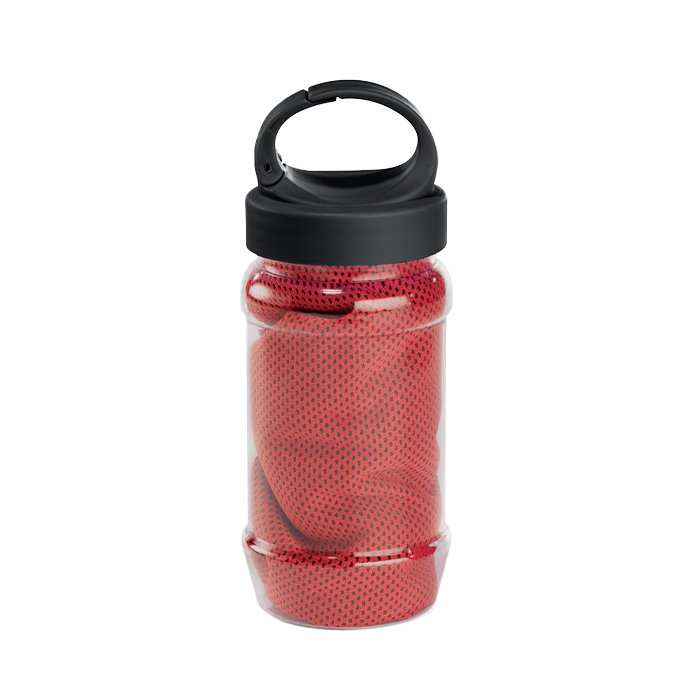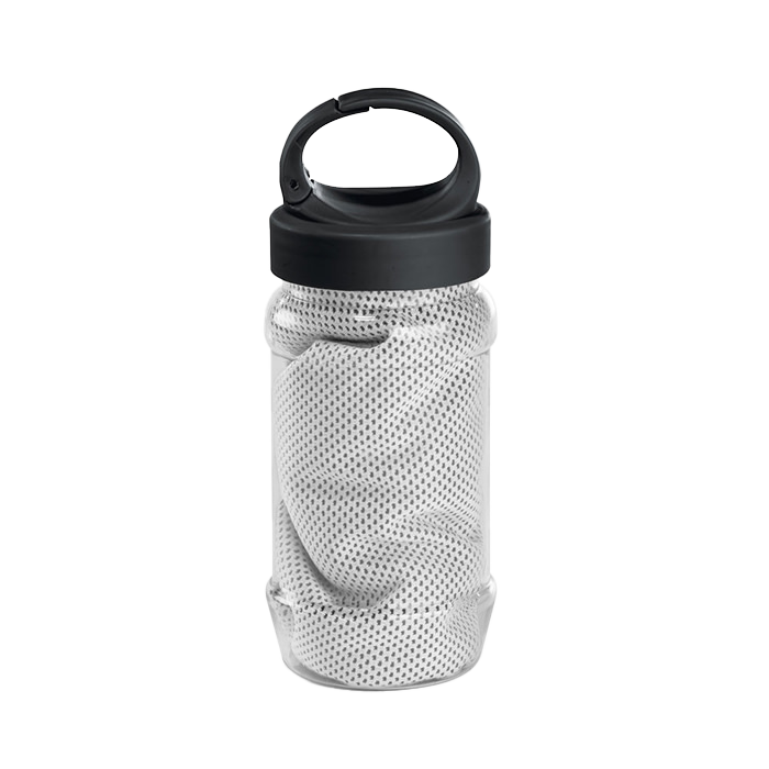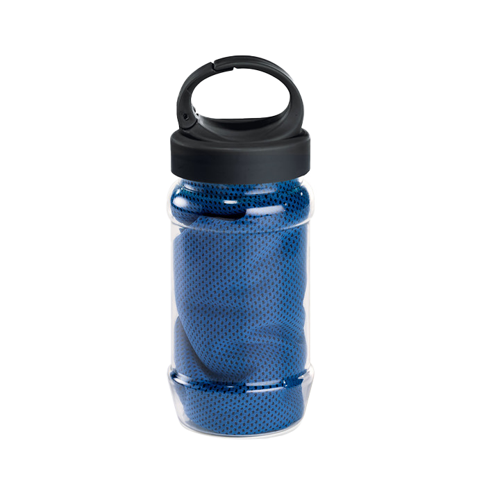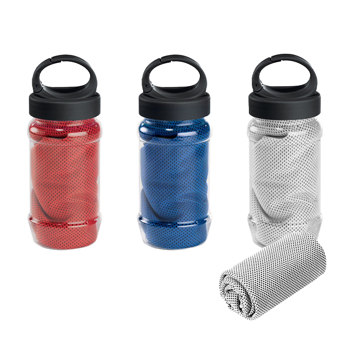 Toalla deportiva de microfibra. Incluye bote plástico con sujetador.