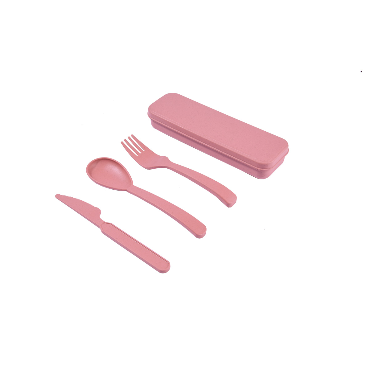 Set de cubiertos portátil material eco-friendly. Contiene cuchara, tenedor, cuchillo y estuche de almacenamiento.