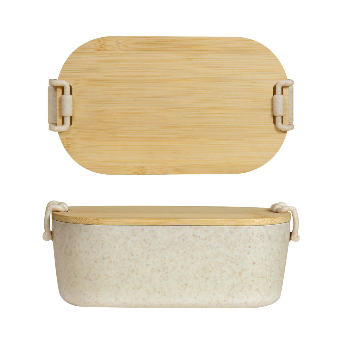 Lonchera de plástico con tenedor y un pequeño contenedor destinado para salsas.