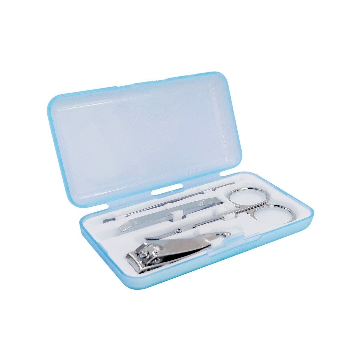 Set con tijeras, 1 pinza para cejas, 1 corta unas y 1 retira cutícula. Tamaño del estuche 10 * 5.3 cm.